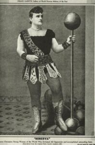 Our first strongwoman is the indomitable Josephine Schauer Blatt, famous under her stage name: “Minerva”. Birth records from the nineteenth century can be mysterious, and there are differing accounts of her early life. She was born in 1869 either in New York or Hamburg, Germany. Being one of our earliest examples of a strongwoman, her career largely involved grand performances on the Vaudeville circuit and in circuses as well as wrestling. The key to these performances center around your ability to draw a crowd; the bigger the crowd, the more money you make. How do you draw a crowd? I’m glad you asked! You draw a crowd by conceiving of wilder and wilder demonstrations of your impressive strength. If the strongman down the street can catch a cannon ball launched straight from the cannon then what about lifting the whole cannon using only your teeth?! You build buzz by offering challenges to other strongwomen, live competitions where you try to lift more than your opponent.
